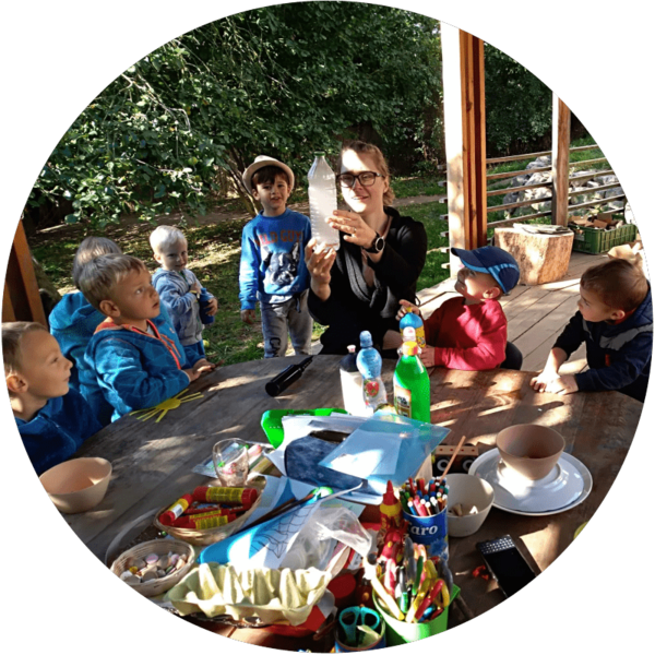 - Objevování: Pokračujeme diskusemi či pokusy na téma, které právě probíráme. Každý týden máme jiné téma učení – jednou zkoumáme život kytovců v oceánu, jindy zase barvy podzimu nebo se seznamujeme s lidským tělem. V průběhu si říkáme básničkami s pohybem nebo písničky.